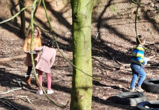 De kinderen maken kennis met ‘op berenjacht’ gaan via een prentenboek en foto’s van de populaire zoektocht als gevolg van corona.